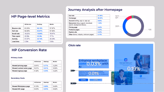 We analyzed user behavior across the homepage using Contentsquare to identify drop-off points, engagement patterns, and baseline performance—highlighting where users were losing context or failing to progress.