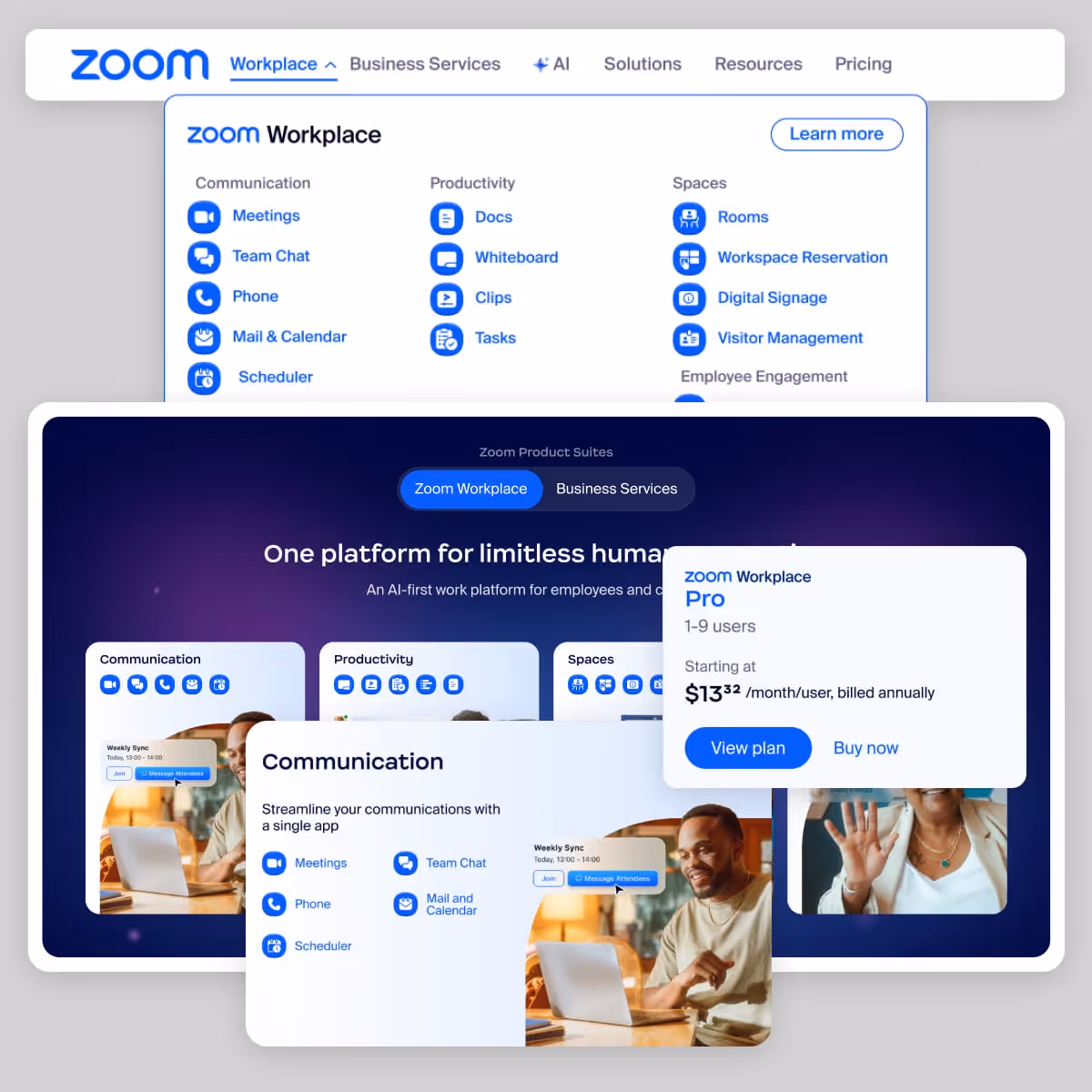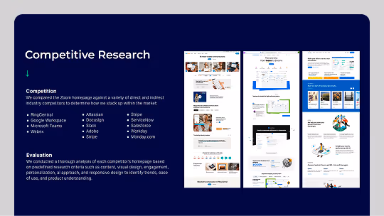 Evaluated how peer companies structured and communicated their platforms, identifying patterns in clarity, positioning, and navigation that exposed gaps in Zoom’s experience.