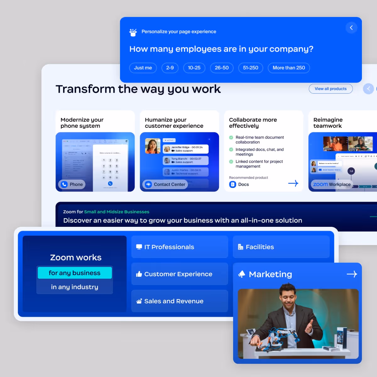Centered on user outcomes, this direction framed Zoom through the problems it solves—highlighting use cases like collaboration and productivity. It also introduced light personalization, allowing the experience to adapt to different audiences and surface more relevant content.